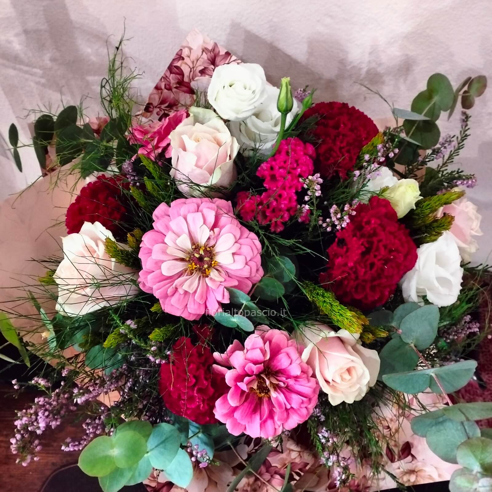 | Bouquet di media grandezza con rose celosia ,zinnie, Erica foglie autunnali Cod. 116811 |