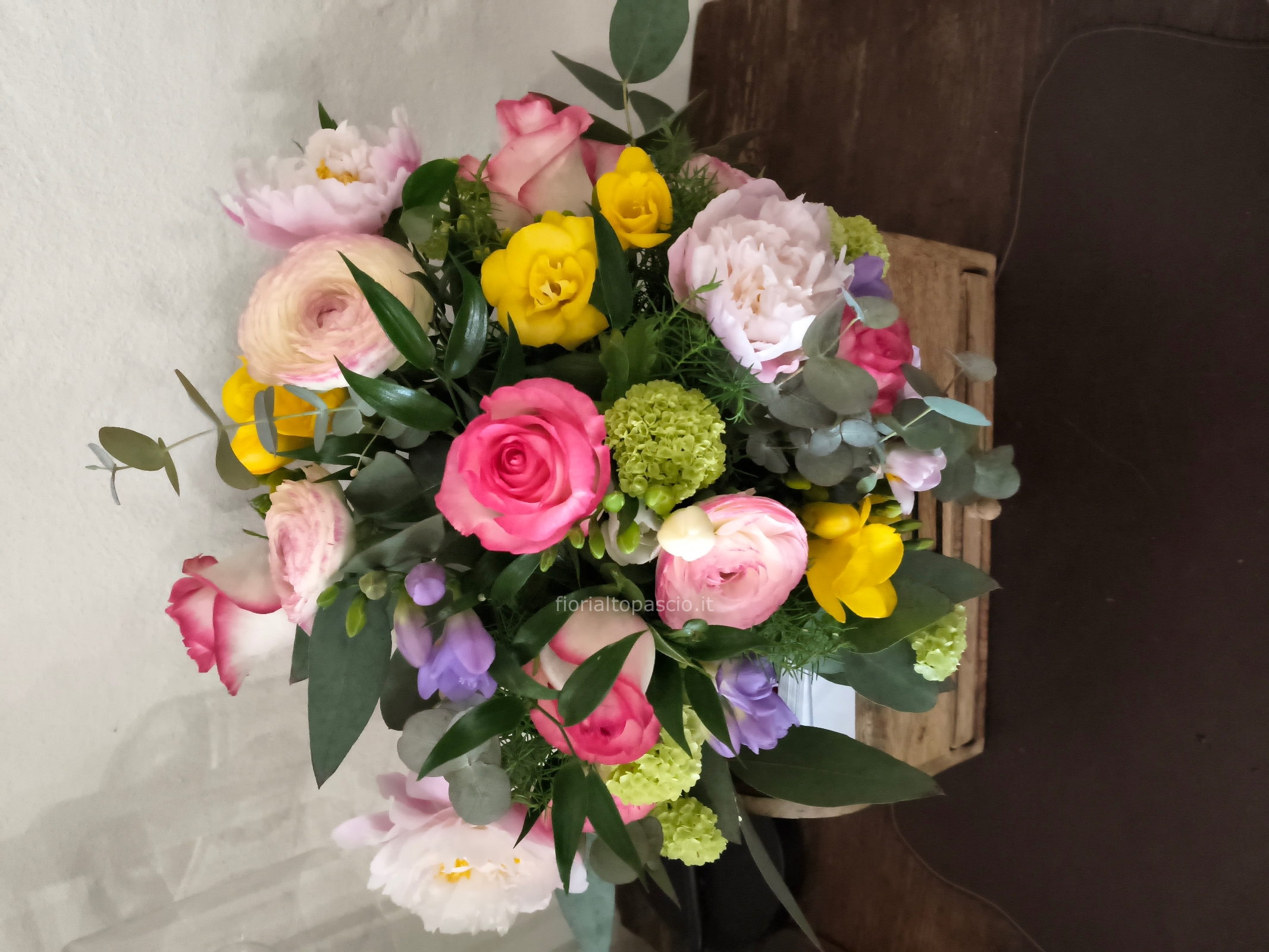 Bouquet misto con rose peonie ranuncoli fresie misura grande