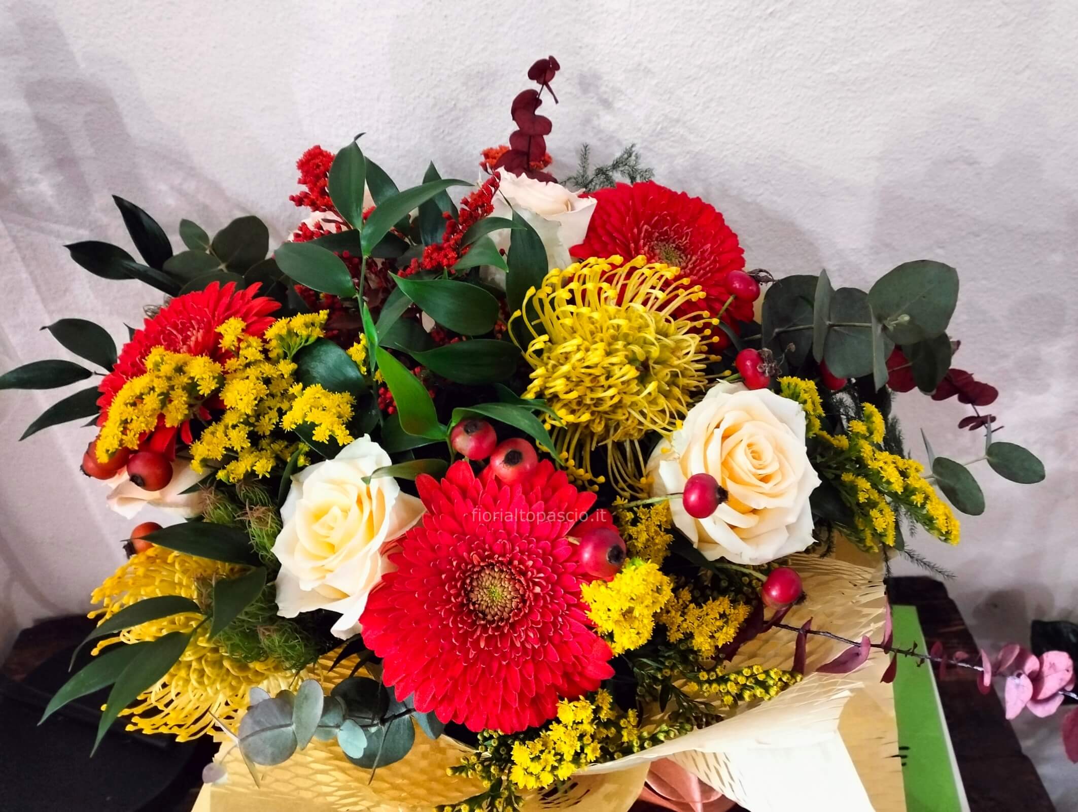 Bouquet misto con Germini roselline protee gialle bacche autunnale media grandezza