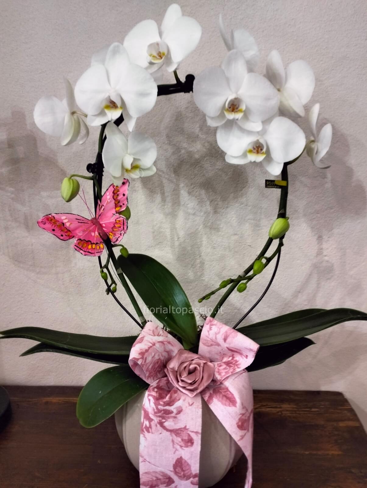Pianta di orchidea fatta ad arco con portavaso in ceramica color tortora